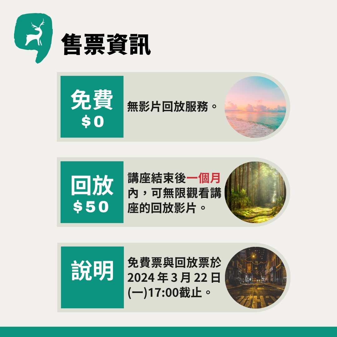 參考影片注意事項1.活動前一天,將寄送行前通知至會員帳號的mail。2.活動結束後兩個工作天內,以YouTube私人影片的方式,將回放影片分享給購買回放票的會員。3.本活動Mood Deer保留最終修改與取消的權利。
