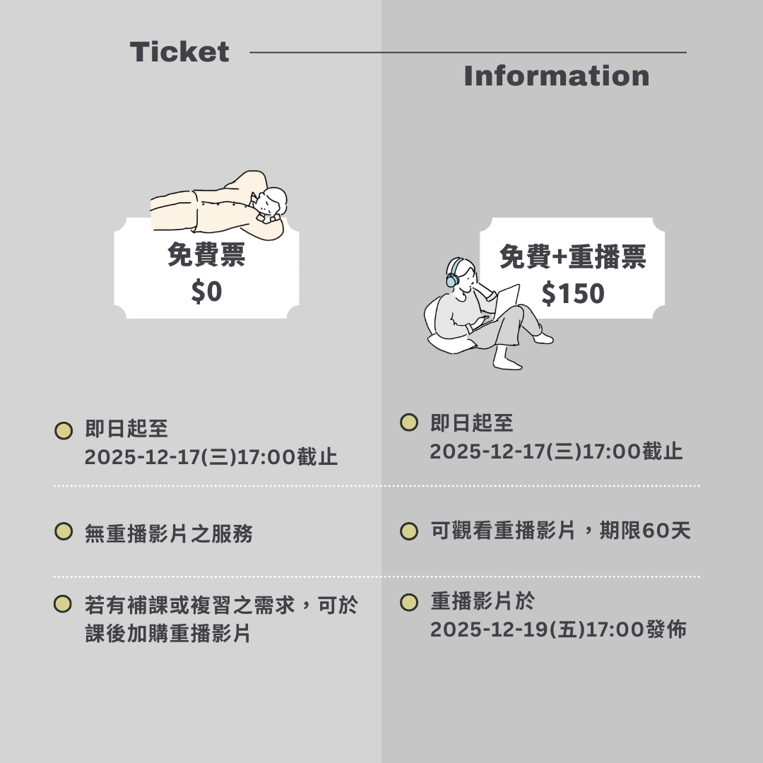 1.購買早鳥票或一般票的會員,可於2025-12-19(五)17:00開始,登入網站後,至【我的回放】,找到本課程,即可觀看重播影片。