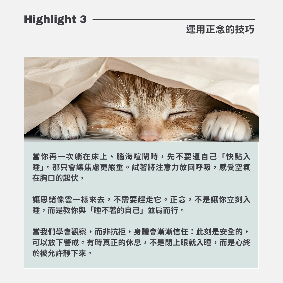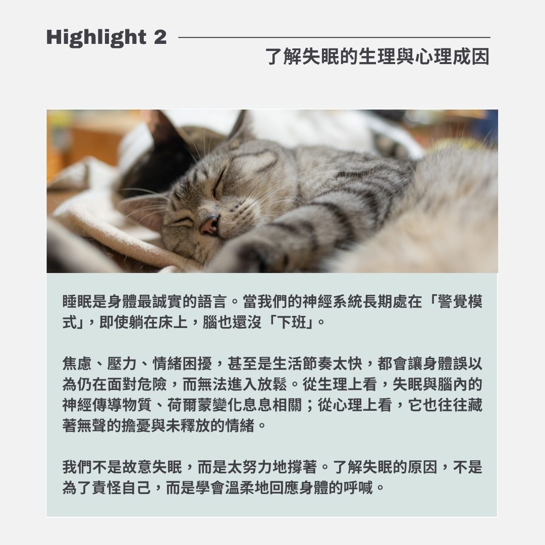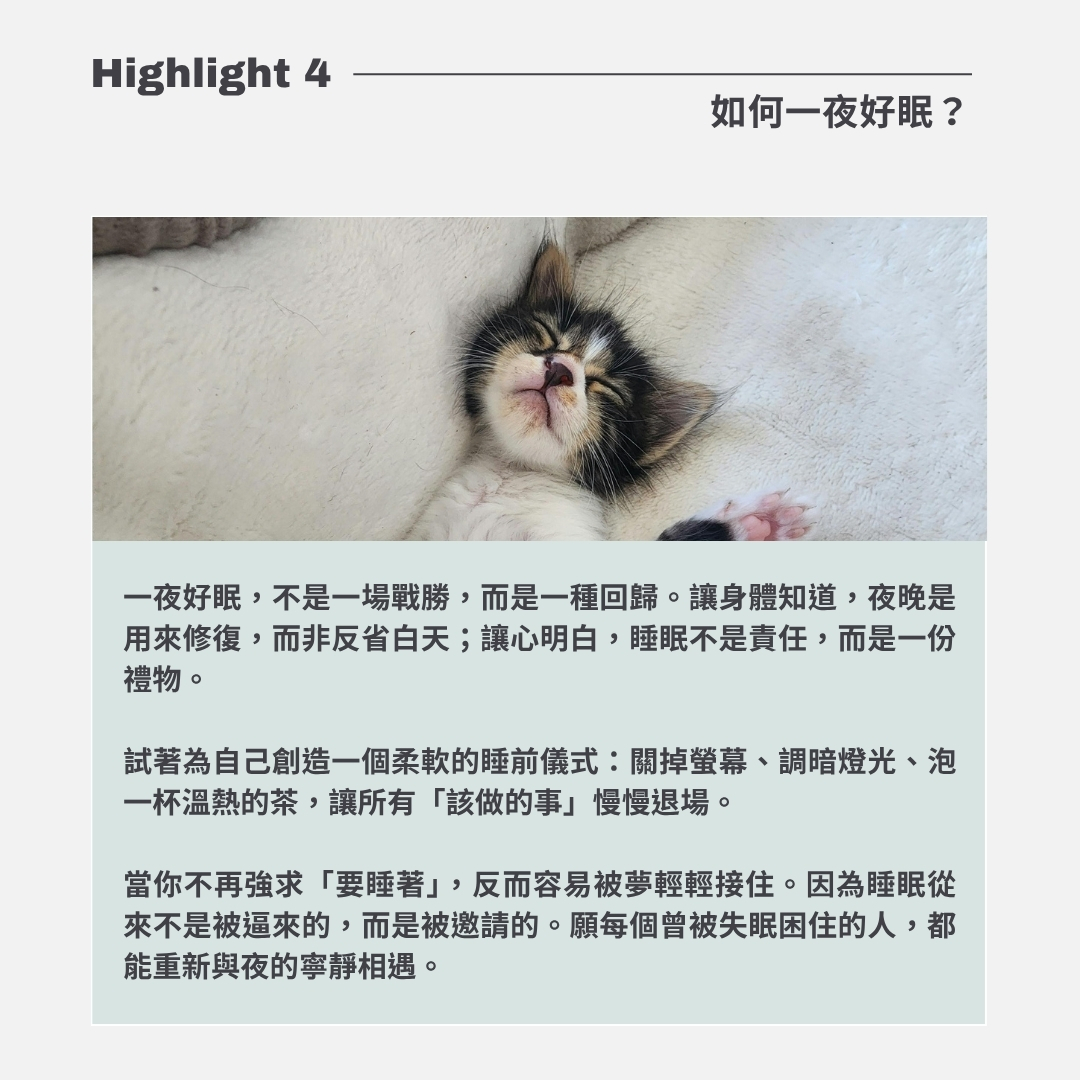 一夜好眠,從來不是戰勝,而是一種回歸。當你放下對睡眠的追逐,夜晚會溫柔地將你接住。願這堂課,成為你重新遇見安穩之夜的開始。