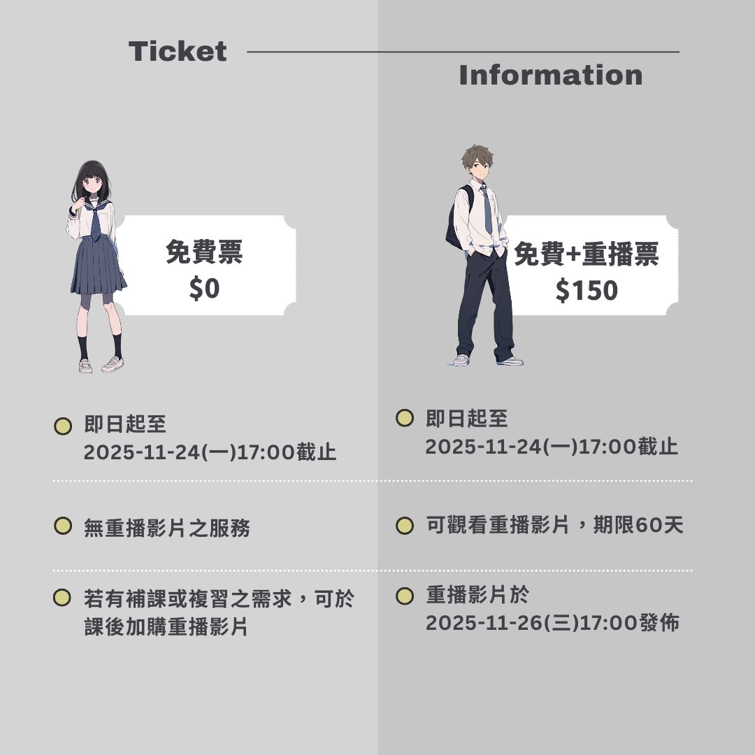 1.購買重播票的會員,可於2025-11-26(三)17:00開始,登入網站後,至【我的回放】找到本課程,即可觀看重播影片。