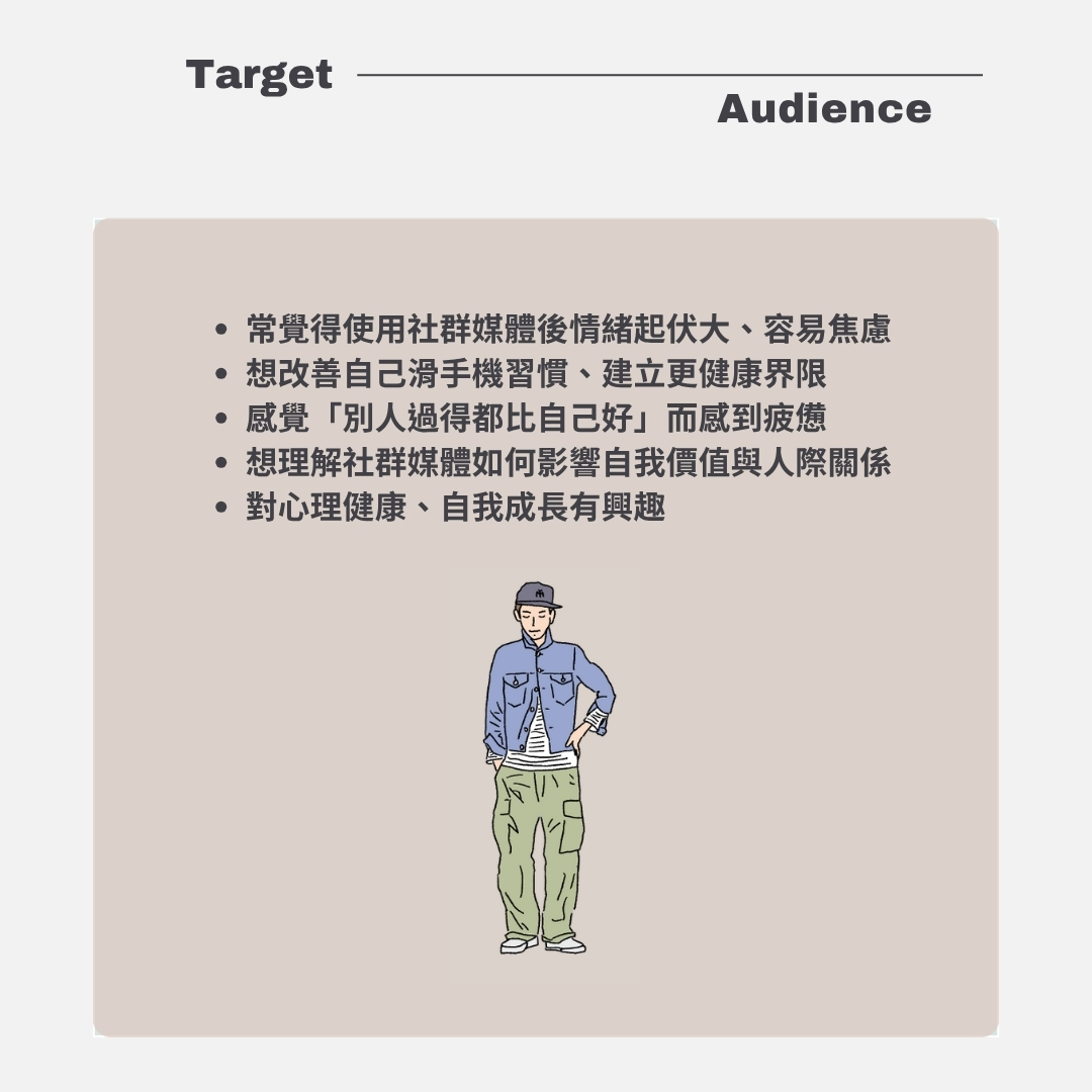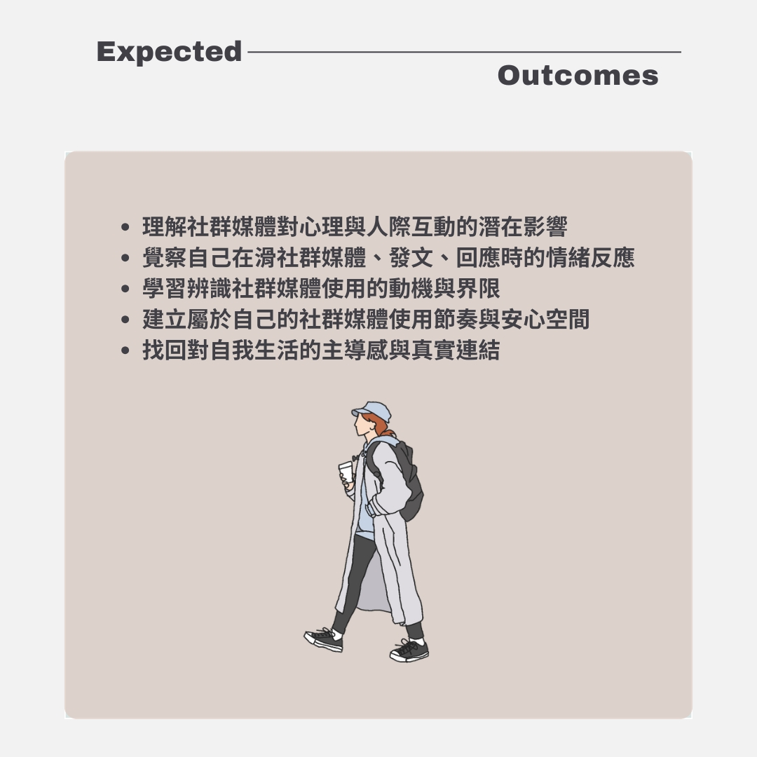 講座將從心理師的角度,帶你看見社群媒體對情緒與人際關係的影響,學習辨識自己在使用社群時的情緒狀態,並思考如何建立健康的界限與使用方式。我們將一起練習,在這個資訊過載的時代,創造屬於自己的節奏與安心空間。