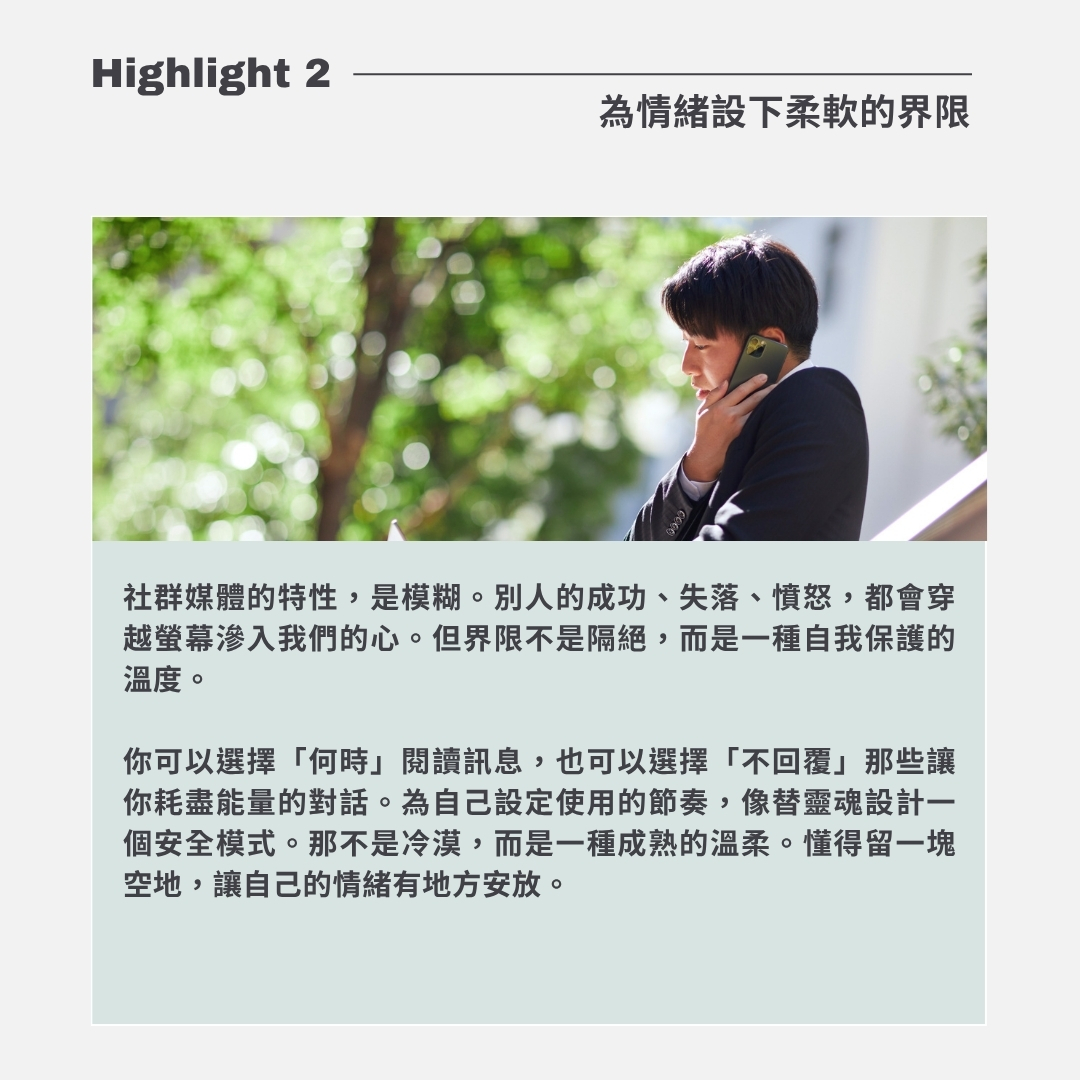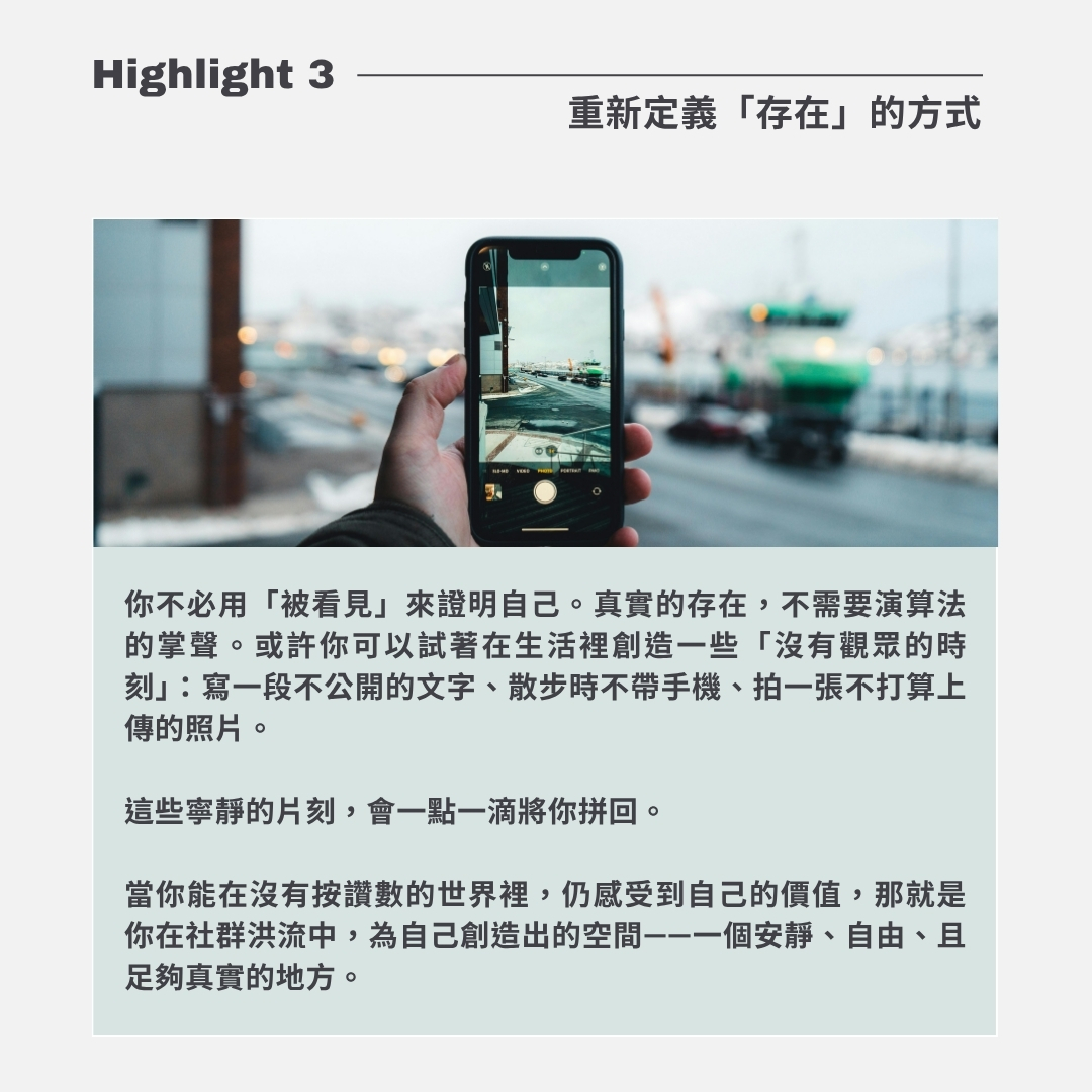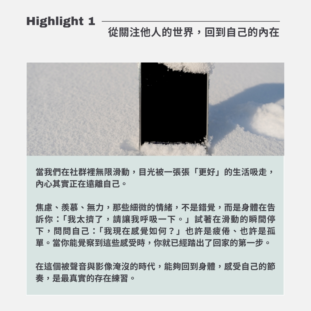 在社群媒體充斥的時代,我們每天都在滑動著別人的生活,也在無形中被比較、被期待、被消耗。當你感覺自己越來越焦慮、羨慕、或失去方向時,也許不是你不夠努力,而是你需要重新與「真實的自己」連線。