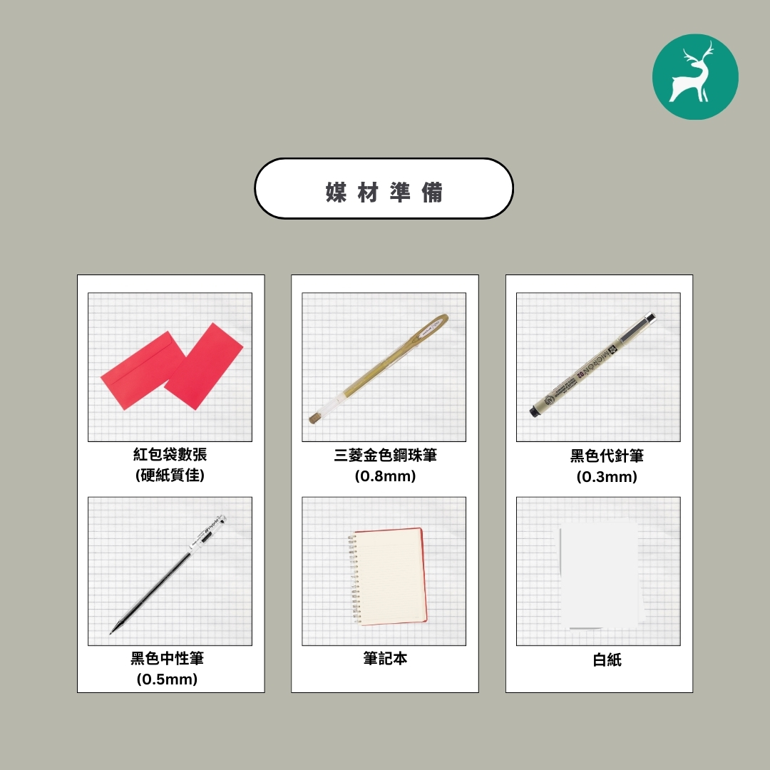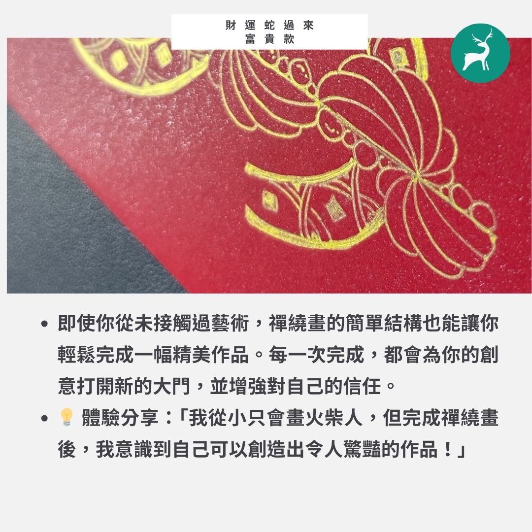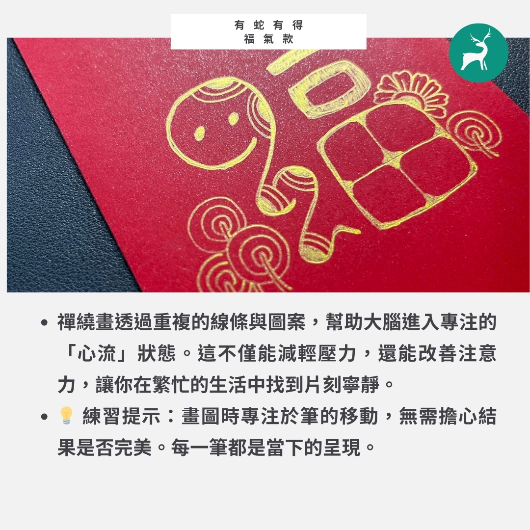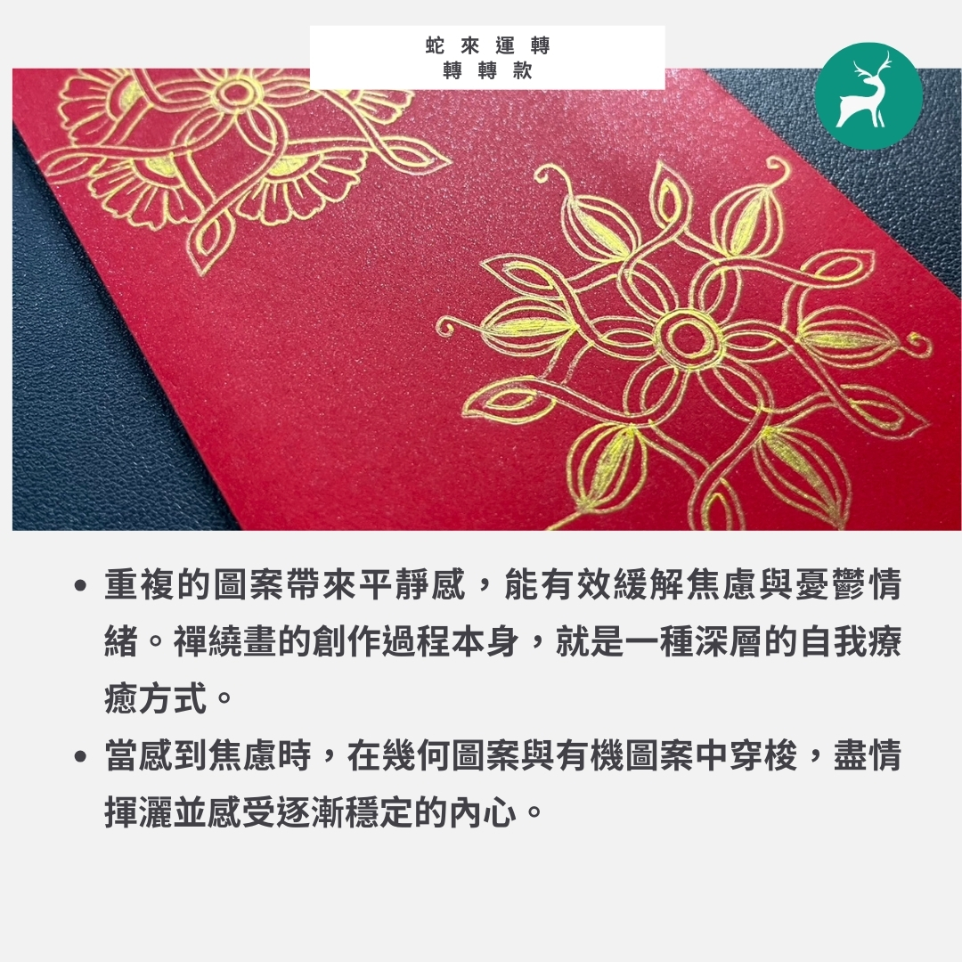 節慶系列禪繞畫迎向農曆新年,要再次和大家藝起線上同樂。2025是俗稱「小龍年」的蛇年,古人相信蛇能帶來好運及財富,同時也有蛻變、轉化的象徵。這堂禪繞紅包袋的課,想跟大家分享三種款式:「有蛇有得福氣款」、「蛇來運轉轉轉款」以及「財運蛇過來富貴款」,有新的圖樣,也有複習的圖樣,歡迎大家藝起來畫畫禪繞、說說吉祥話!