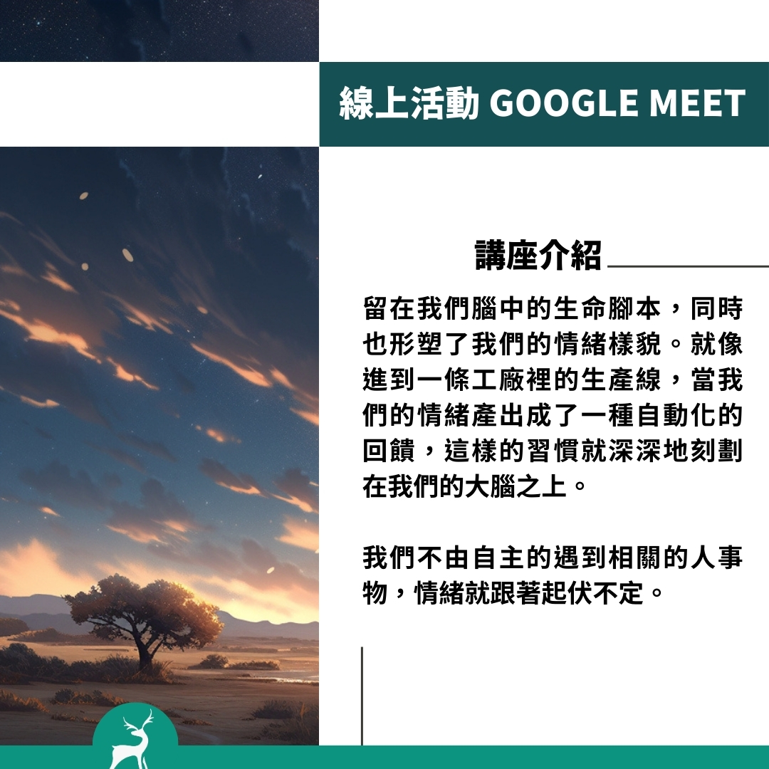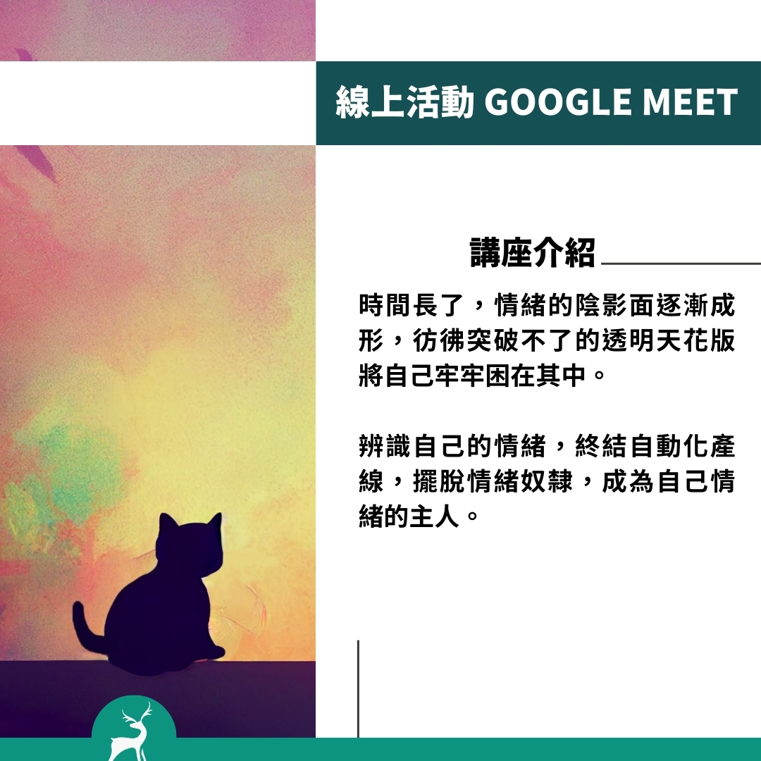 2.行前通知為輔助與提醒性質,主辦單位無法保證每位報名者皆能收到。若沒有收到通知,請登入Mood Deer,前往「我的課程」,接著選「課程票券」,找到該場活動,並點「快速取票」,即可依照票券顯示時間進入Google Meet。此為進入Mood Deer線上活動的標準程序。