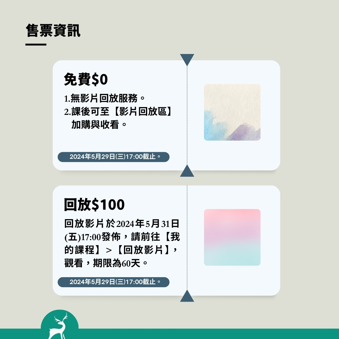 1.購買回放的民眾,可於2024年5月31日(五)17:00開始,登入網站後,至【我的課程】>【回放影片】找到該場活動,即可觀看回放影片。