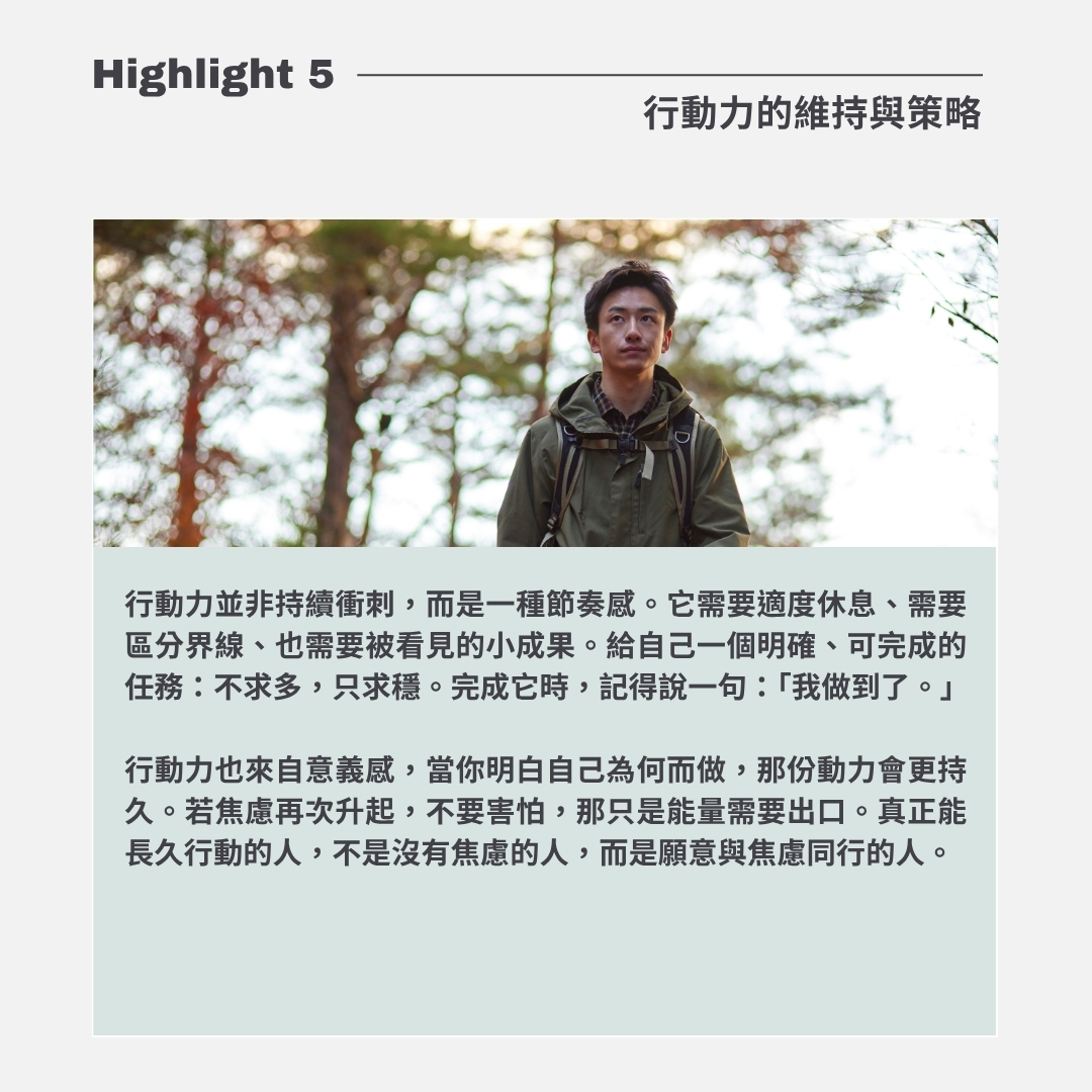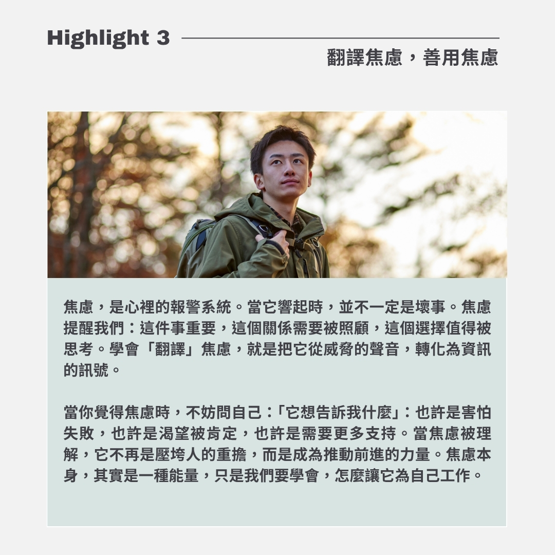 這堂講座不會逼迫你更加自律,也不是「再努力一點」的雞湯,畢竟生活已容不下更多的壓榨了。我們會用更溫柔、更真實、更有效的方式,和內在的焦慮對話:「我知道你在保護我,我願意帶著你一起前進。」