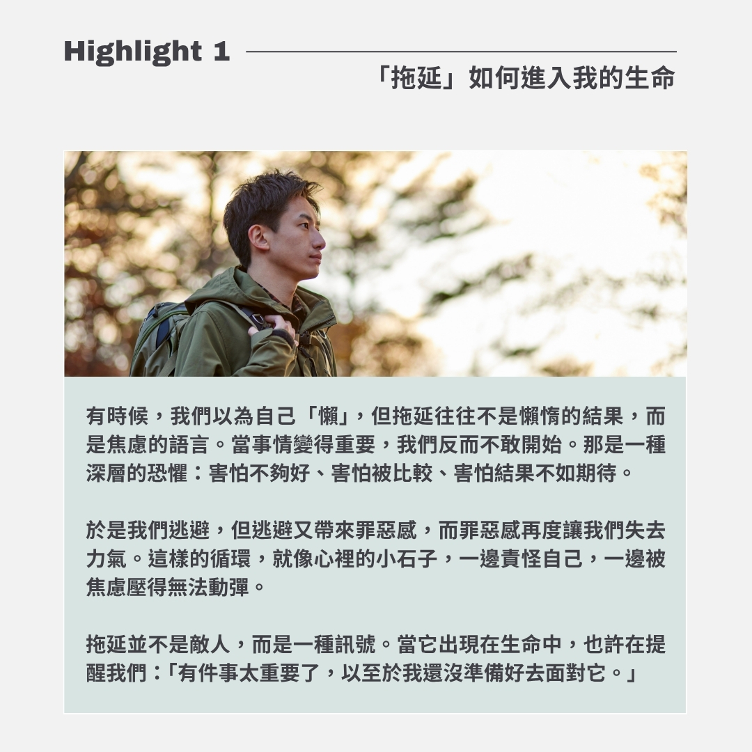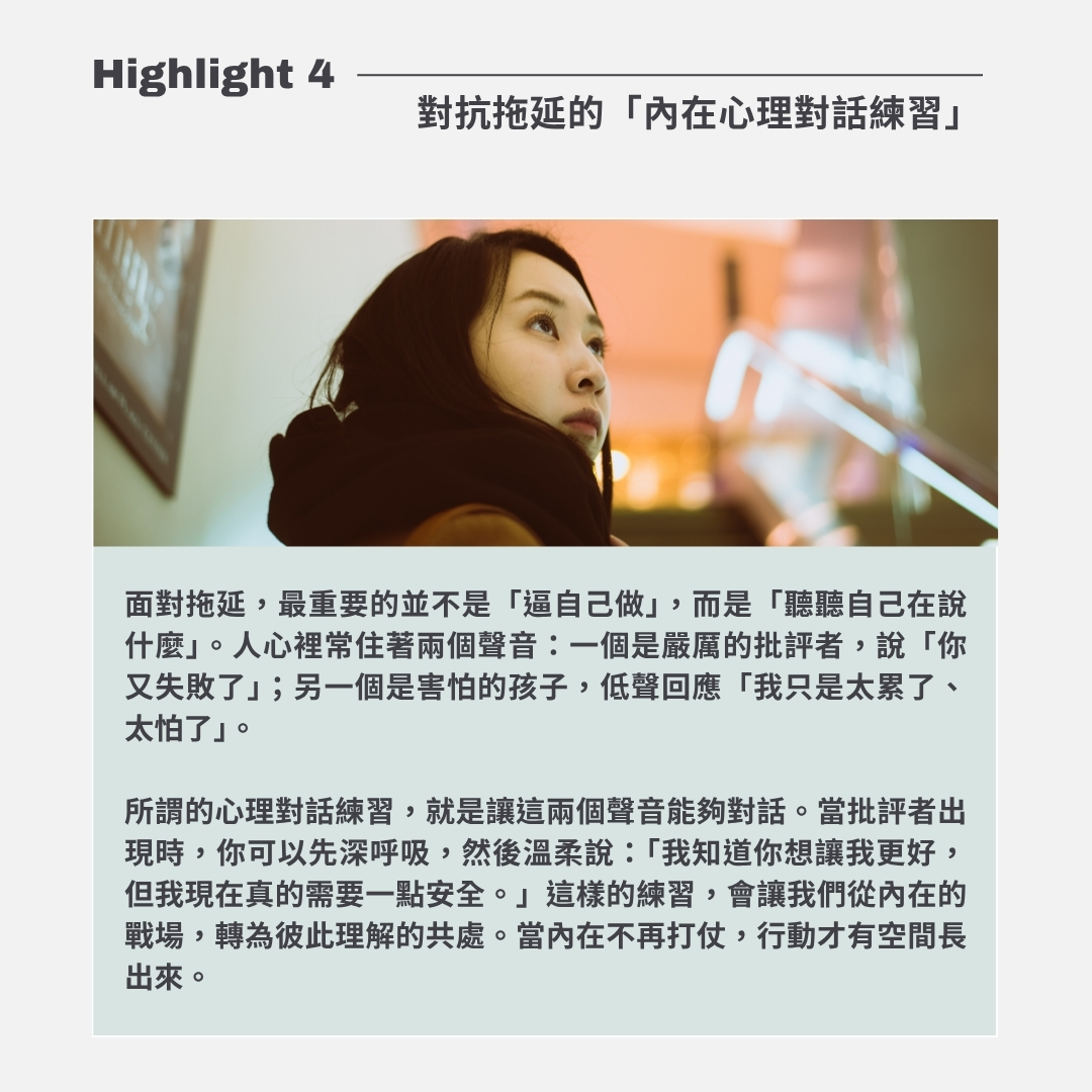 透過心理對話練習,我們會把拖延從「自我責備」轉化為「看見、理解、然後開始」。不是一下衝到終點,而是踏出那個真實的第一小步,休息片刻後,喚醒那個願意前進的自己。