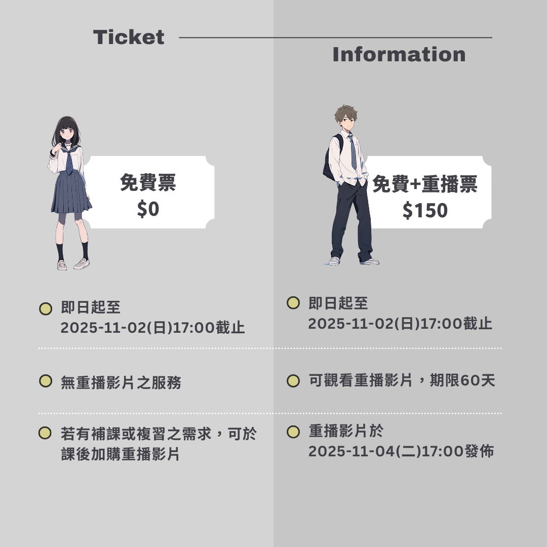 1.購買重播票的會員,可於2025-11-04(二)17:00開始,登入網站後,至【我的回放】找到本課程,即可觀看重播影片。