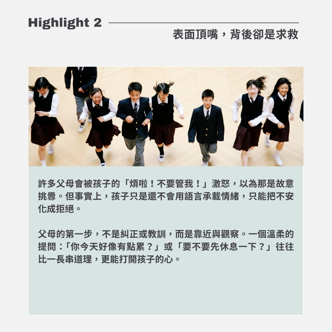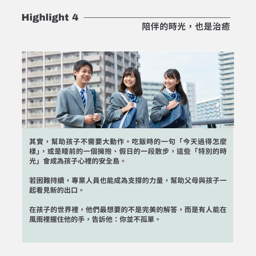 有時候,一句貼心的「我懂你辛苦了」,或一個不帶批評的傾聽、一段屬於你們的小小時光,都可能成為孩子心裡的力量來源。這不只是安慰,而是陪伴他們逐漸學會看見、理解、並調整自己的情緒。