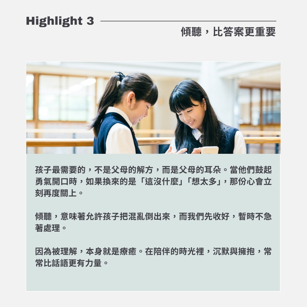 身為父母或陪伴者,我們的第一步,不是急著給建議或糾正,而是練習去看見、去聽見。細心觀察孩子情緒的蛛絲馬跡,並在他願意開口時,用真誠與溫柔回應,而不是倉促評斷。當我們願意放下「要求」,多一些理解,就能在對話中讓孩子感受到安全與支持。
