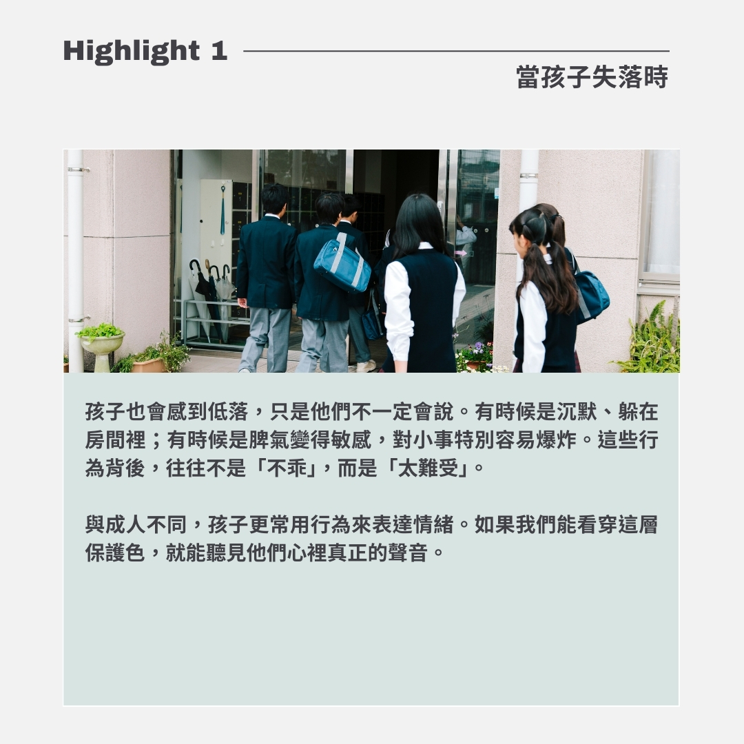 在成長的旅程裡,他們和我們一樣,都會經歷低落、不安、焦慮,甚至陷入憂鬱的漩渦。只是,他們表達情緒的方式,往往與成人不同:有的孩子變得易怒、退縮或愛發脾氣;有的青少年沉迷網路、成績下滑,卻很少直接告訴你「我很難過」。