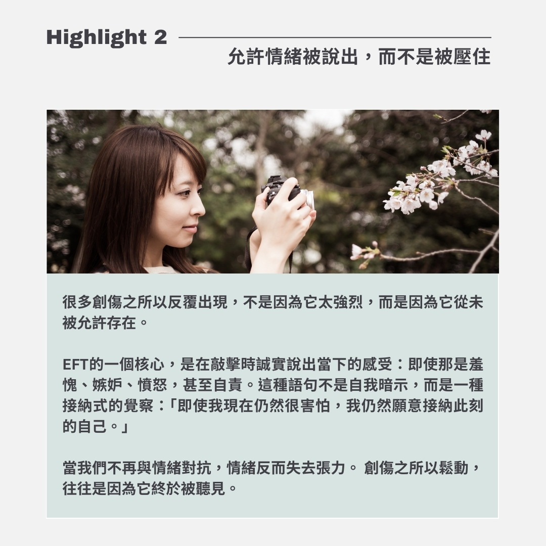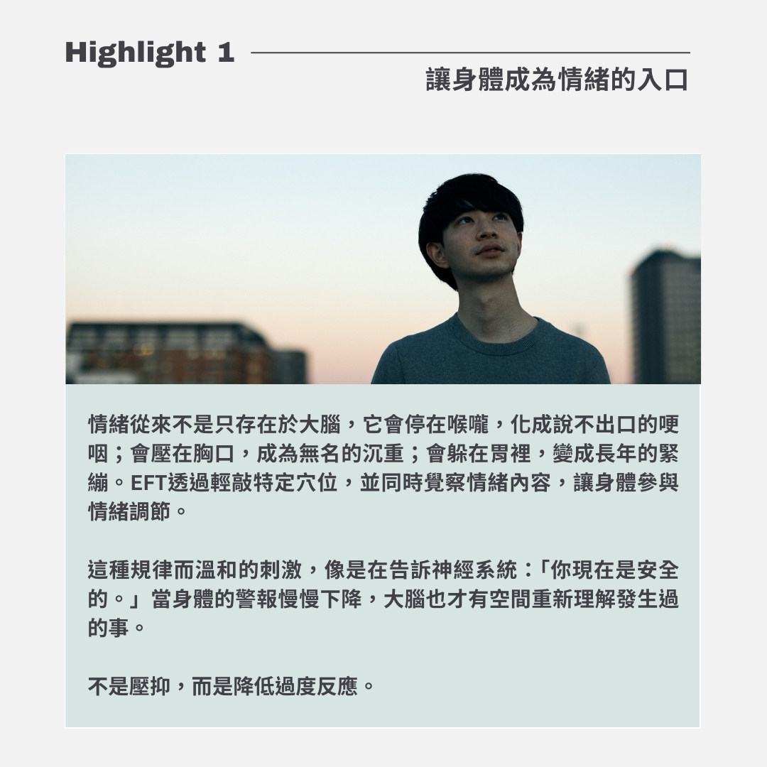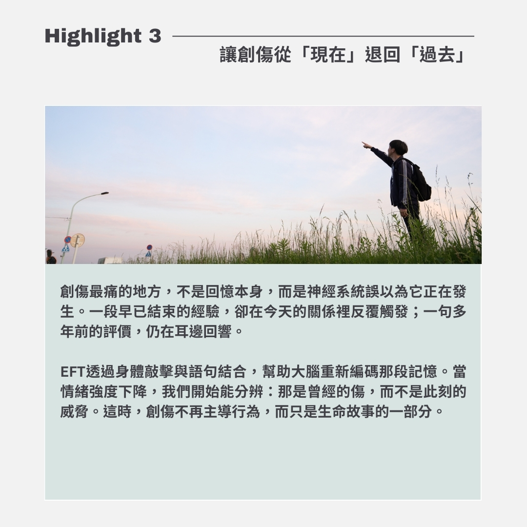 透過科學實證的情緒釋放技巧(EFT),我們將跳過冗長的理性分析,直接向神經系統發送安全訊號,溫柔釋放積壓已久的創傷能量。