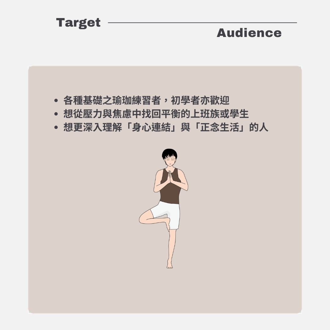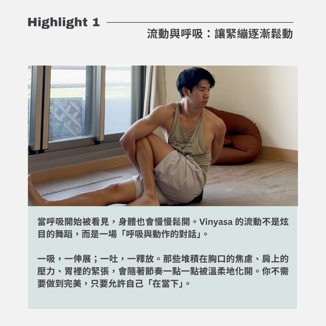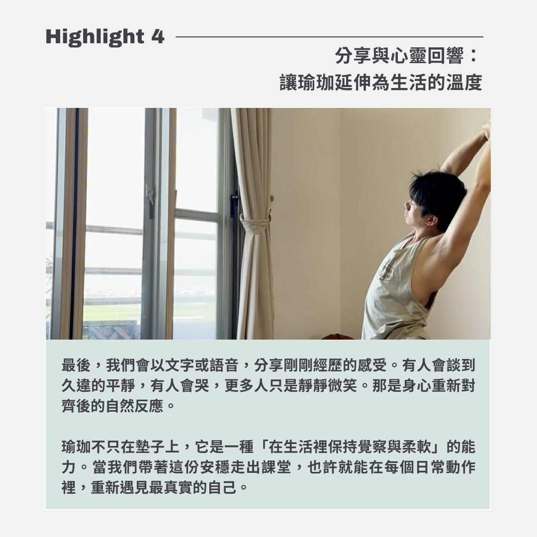 整堂課包含約50分鐘的正念流動瑜珈練習,並在結尾設有「覺察與心靈分享」的回饋環節。這不是一堂追求完美動作的課,而是一段——「從身體出發,回到自己」的練習。