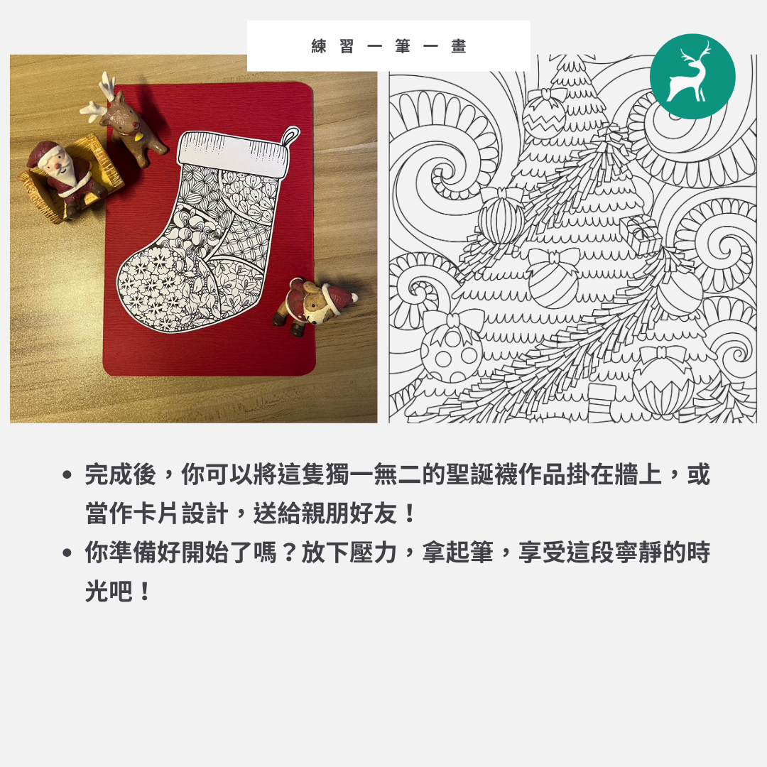 「掛起聖誕襪,隔天就會收到聖誕老公公送給你的禮物…」即將到來的聖誕節,是一個溫馨又歡樂的節日,幾近年末,也讓我們有機會好好整理這一年來的自己。節慶系列的禪繞畫課程,將帶領大家完成屬於自己的聖誕襪,想一想,你想送給自己新的一年什麼樣的禮物,藝起裝進襪子裡囉!