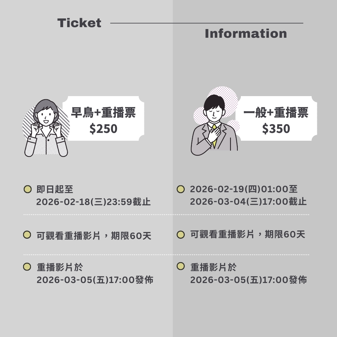 1.購買早鳥票或一般票的會員,可於2026-03-06(五)17:00開始,登入網站後,至【我的課程】>【回放】,找到本課程,即可觀看重播影片。