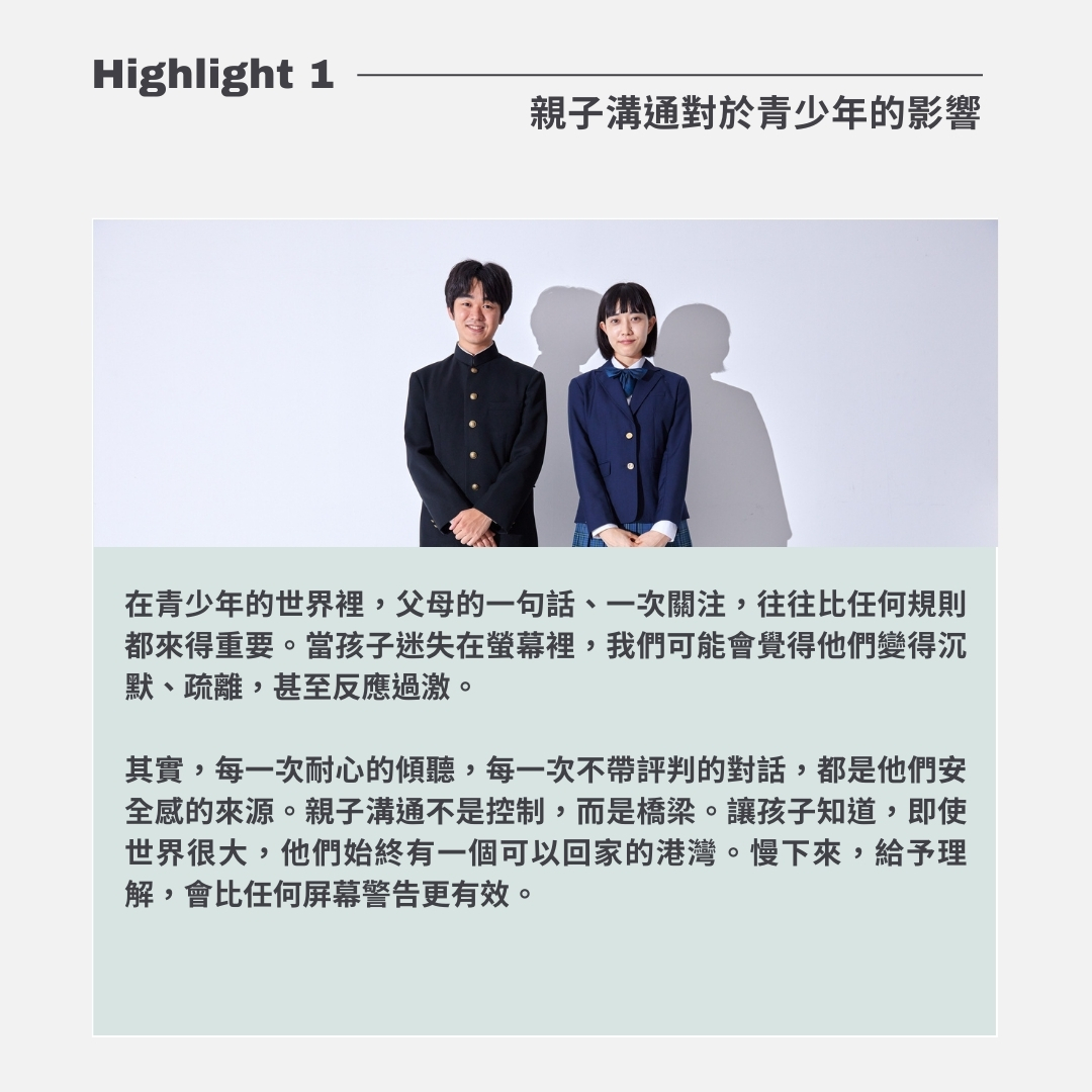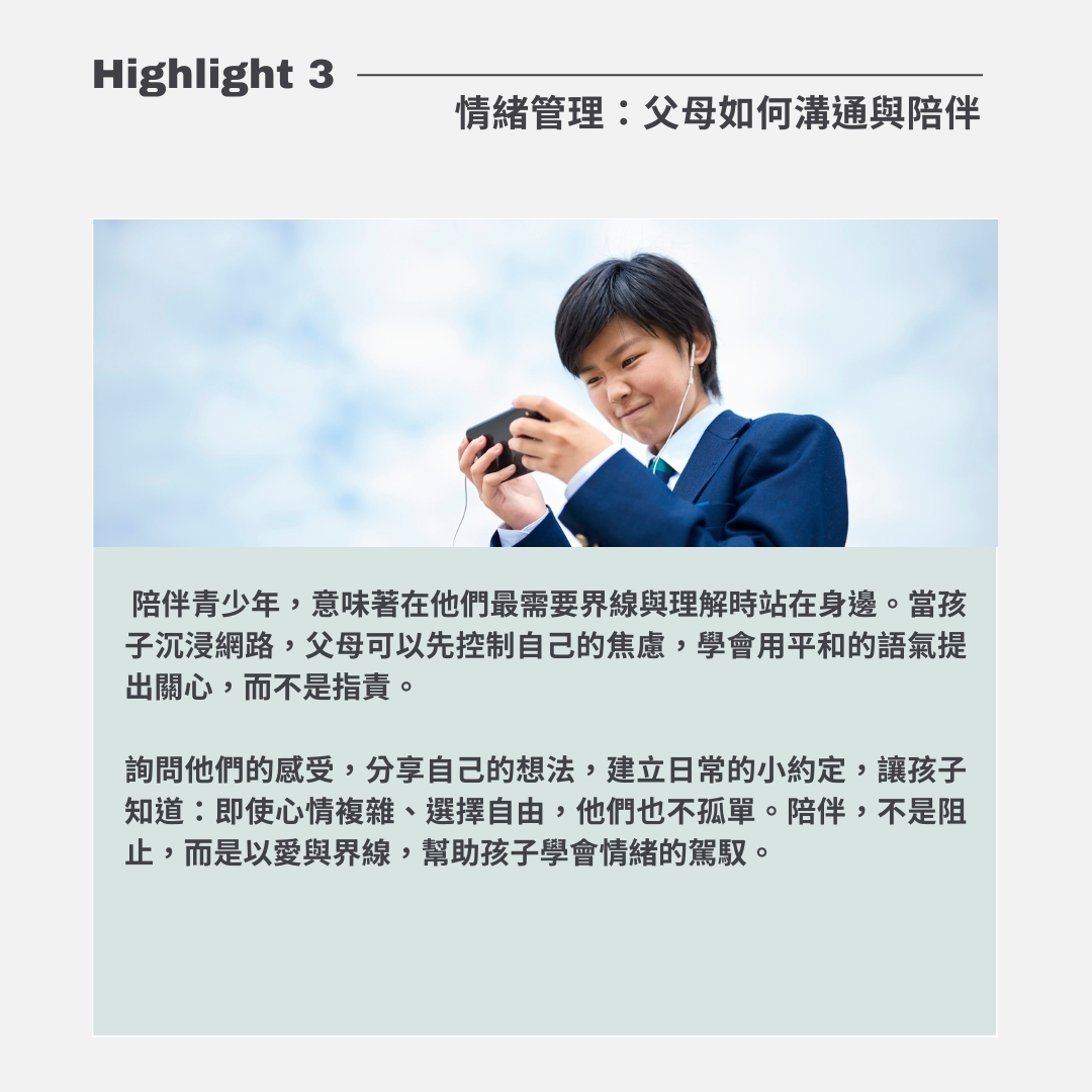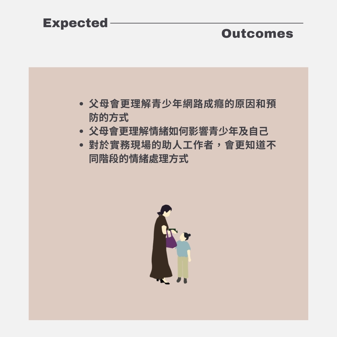 透過講座及經驗分享,教導父母更貼近青少年的互動方式,協助他們長出自信和獨立,也學會在網路風暴期消化自己的情緒。
