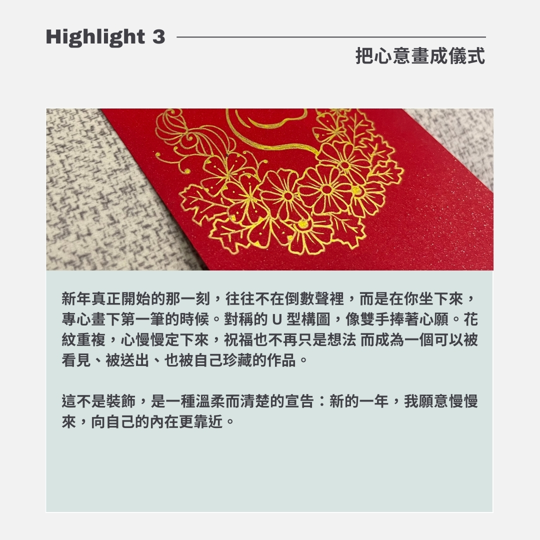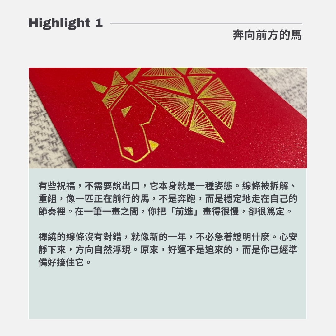 你會發現,這不只是裝飾紅包袋,更是一種為新年設定心意與方向的儀式,完成的禪繞紅包袋,可以送給重要的人,也可以留給自己:提醒自己在新的一年裡,願意停下來接住好運,也相信好運正在靠近,把好運,「馬」上畫進生活裡!