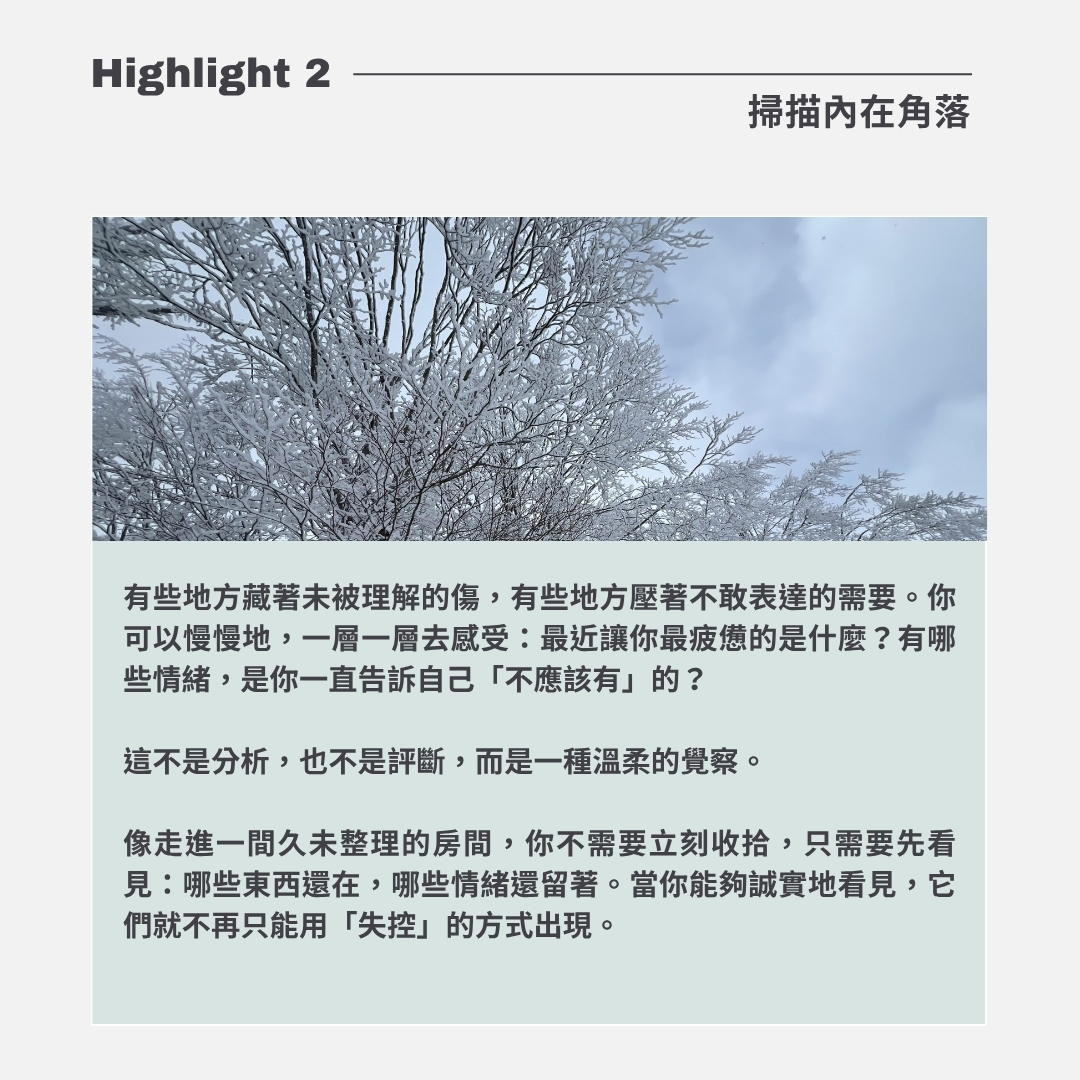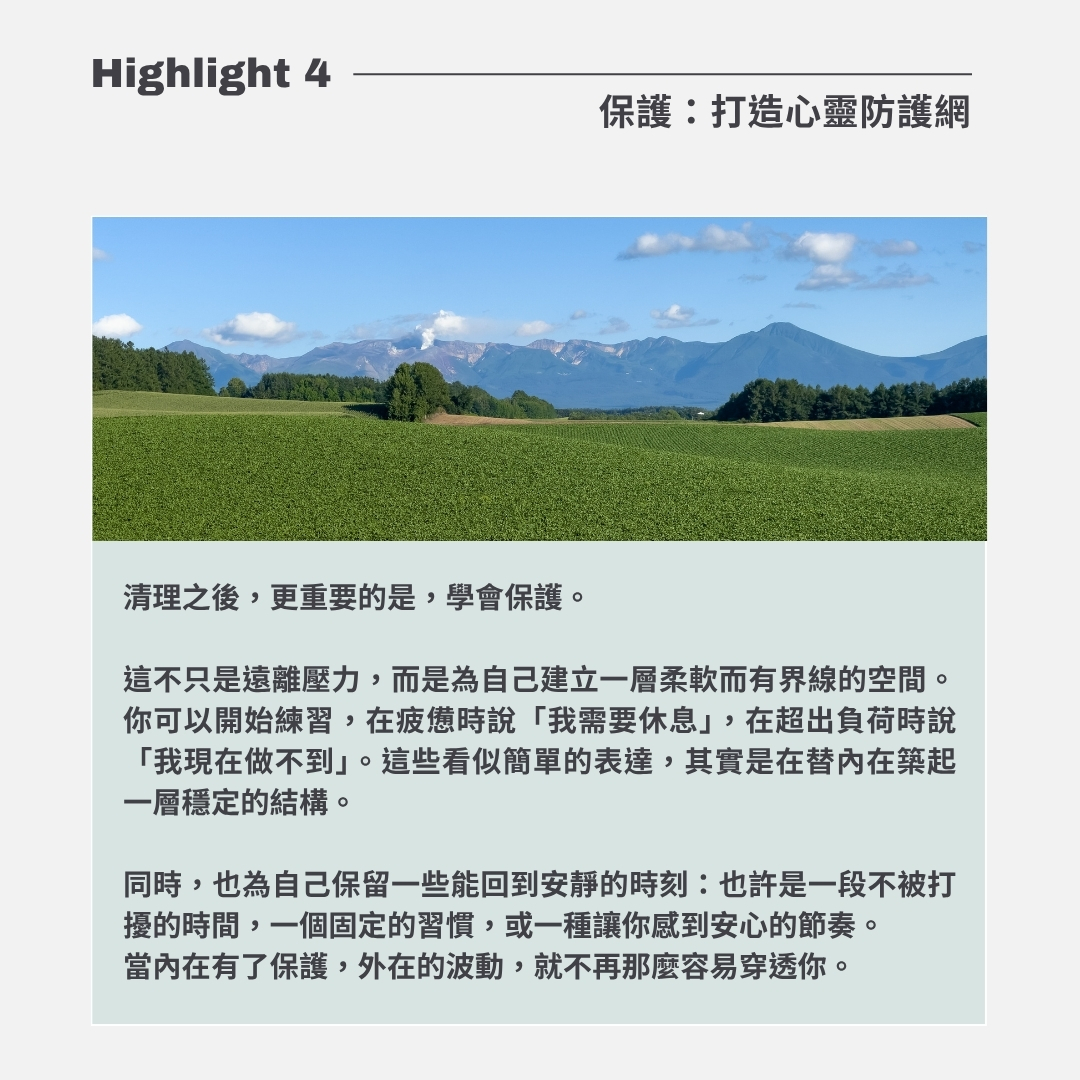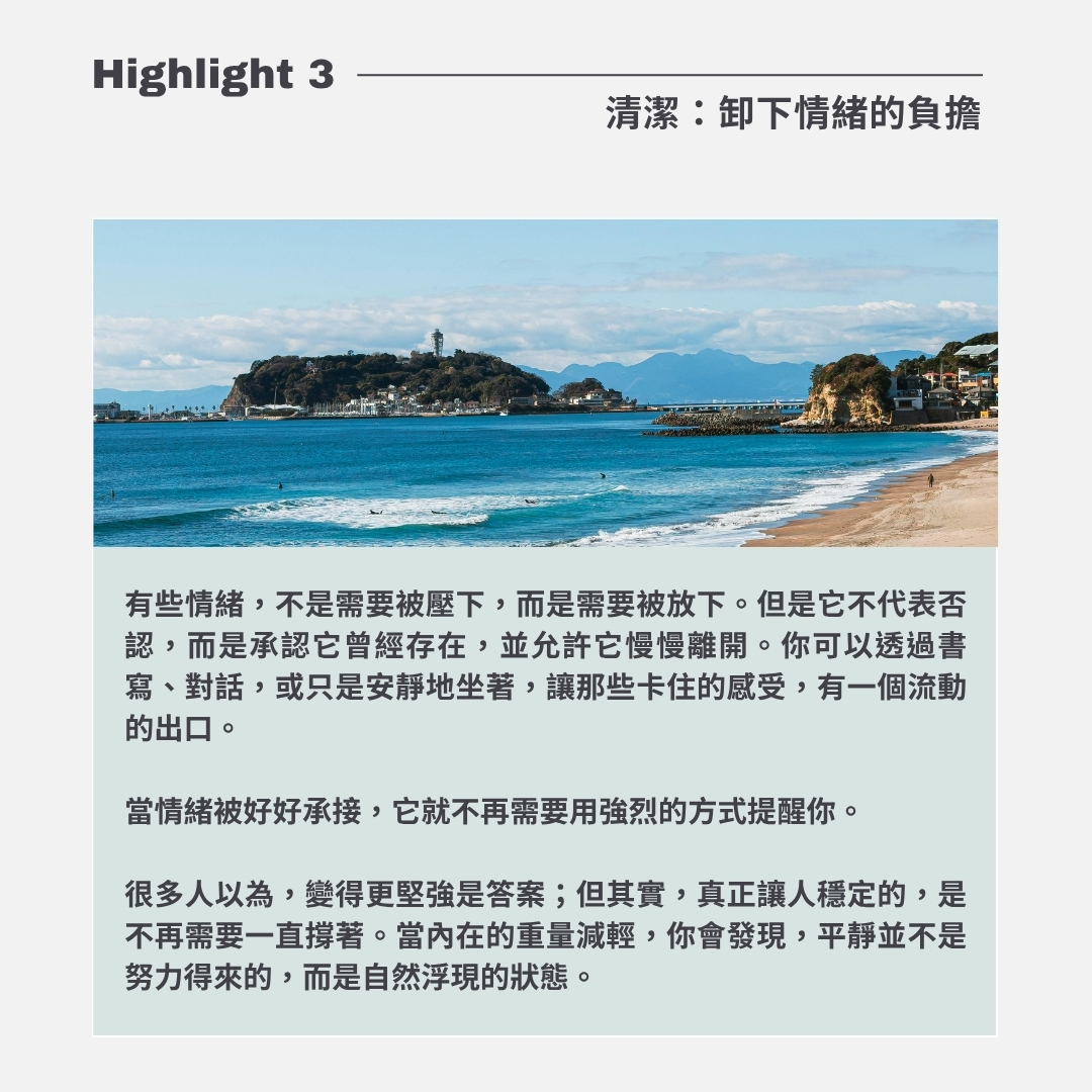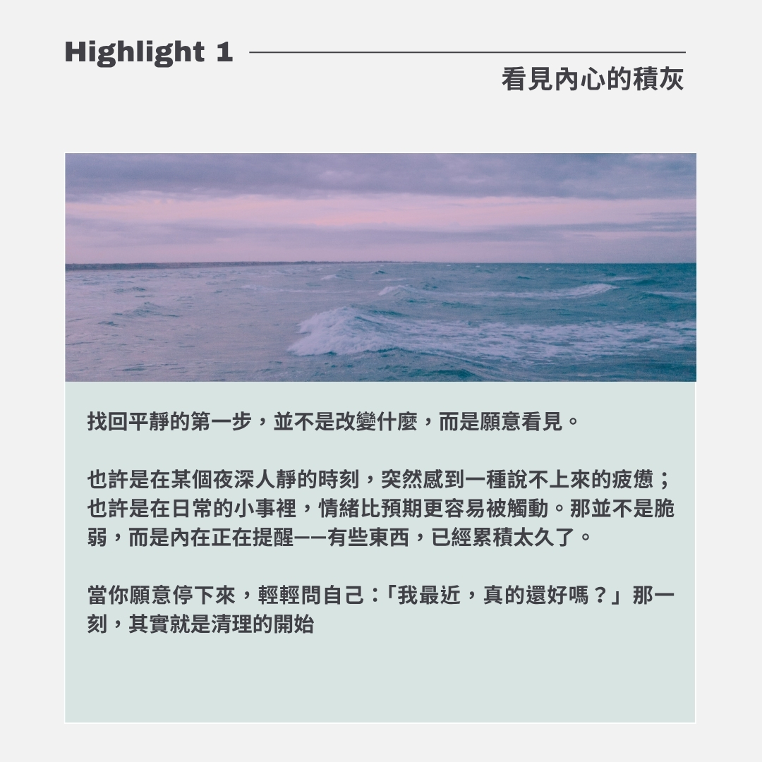 在現代的快節奏日常裡,我們都會記得手機要定期清理快取、家裡習慣掃地除塵,但我們似乎忘了為「心靈」安排一場大掃除。當生活被待辦清單與社交噪音填滿,心裡難免積起厚厚的灰塵,讓我們感到疲憊、模糊,甚至在忙碌中迷失了方向。