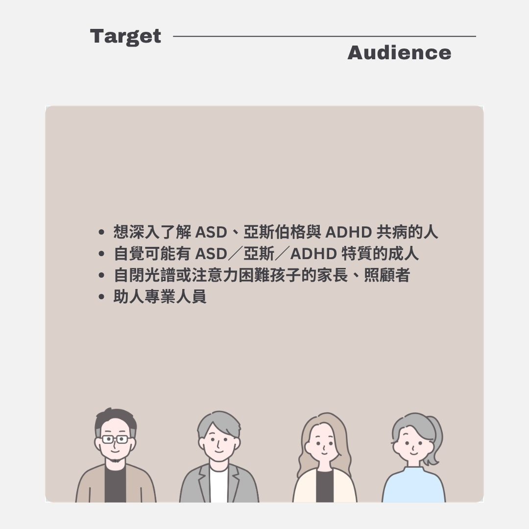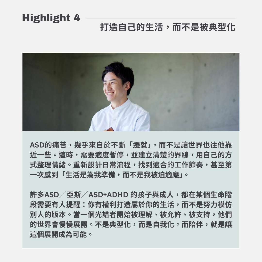 除了科學與臨床歷程,本講座更聚焦於「陪伴」——如何看見光譜者的需求、優勢與潛能,並協助他們打造適合自己的生活,而不是被迫成為典型的樣子。