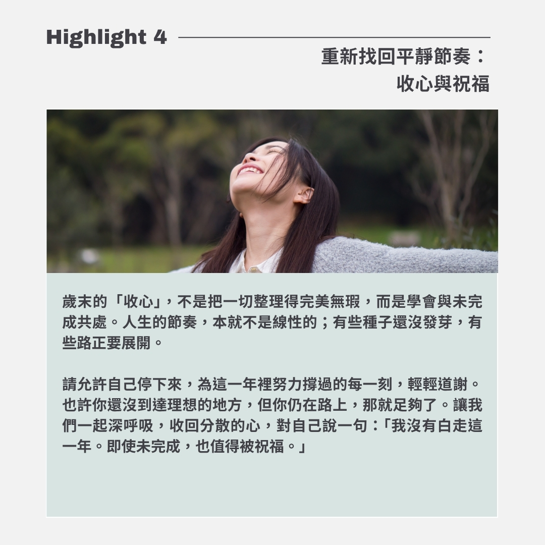 每到年末,不只公司在關帳,我們的心也準備關帳,一整年累積的壓力、未完成的清單、沒有說出口的情緒都會在這時候湧上來:有人開始焦慮:「我怎麼好像沒有進步,是不是又浪費了一年?」,也有人可能會感到疲憊:「這一年來的努力有什麼樣的意義?」也許你有著更多、更複雜的感受,這些都是「心理關帳效應」的自然反應。