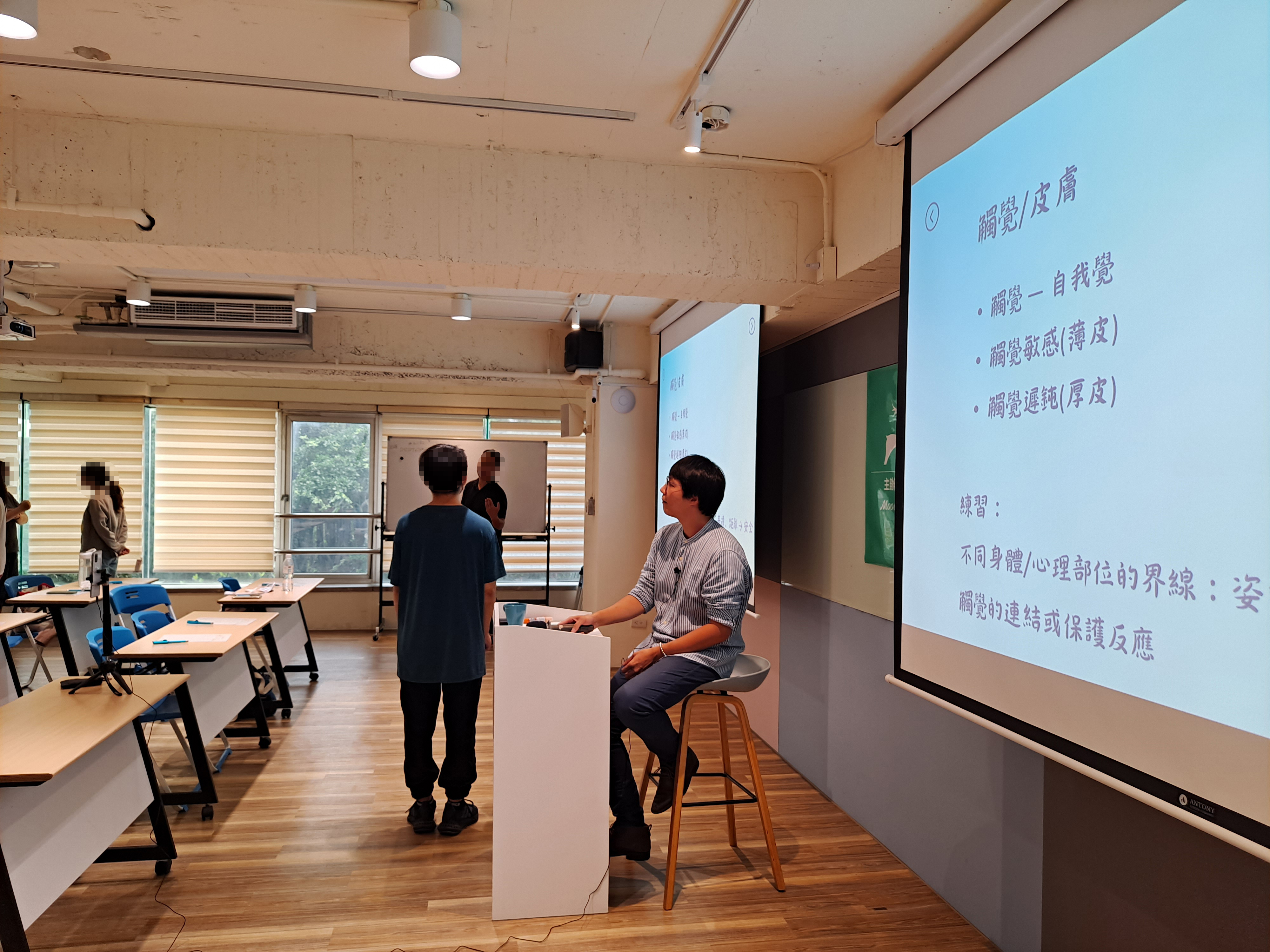 界線被過度侵犯,最常見的是被威脅、被虐待、被責備,使我們的界線感模糊。沒有被解決的情緒,隱藏在我的身體的各個部位,並不容易被察覺。第一步練習:學員們各自尋找三個人,互相詢問對方姓名、居住地以及興趣,建立「界線」。